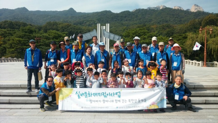 복지1과 실버문화재지킴이사업 1. 3세대 통합 프로그램  '할아버지. 할머니와 함께 걷는 북한산둘레길'   북한산들레길지킴이 어르신들과 인수유치원 대상으로 프로그램 진행하였습니다.  국립4.19민주묘지에서 기념답 참배, 4.19혁명기념관 관람, 잠자리만들기 체험활동를 통해 1.3세대통합에 기여하는 기회를 가졌습니다.