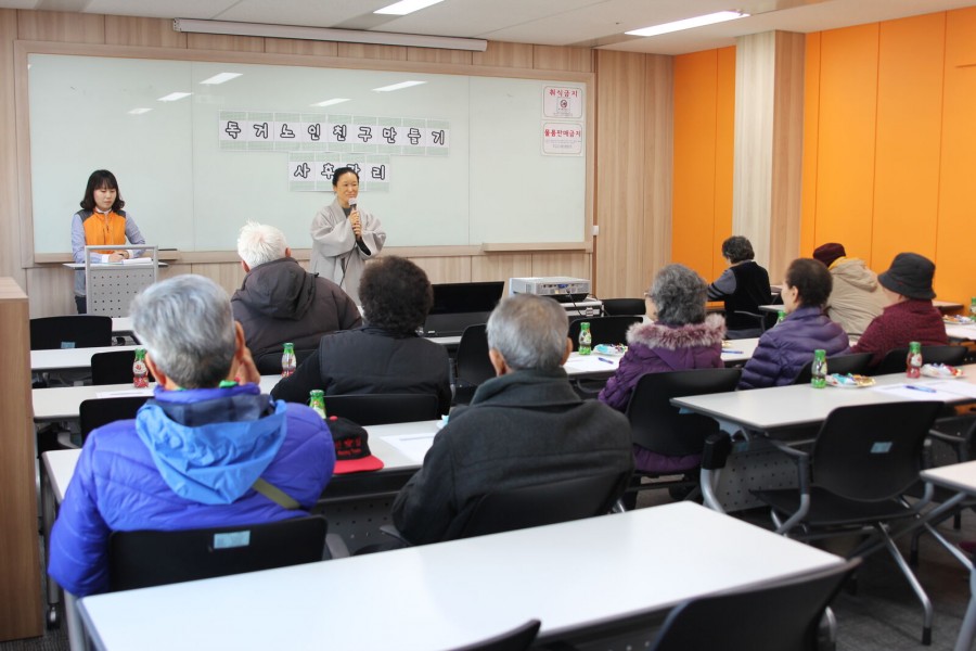 본 복지관에서는 믿고 의지할 수 있는 1명 이상의 친구를 만들어주고 상호돌봄체계를 구축하고자 독거노인 친구만들기사업을 진행하고 있습니다. 사업을 마무리하며 2015년 독거노인 친구만들기사업 평가회를 진행하여 수료증 전달과 어르신들의 소감을 들어보는 시간을 가졌습니다.
