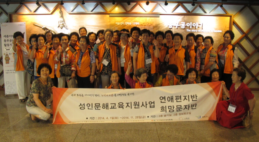 사회교육 사업에서는 '세종이야기·충무공이야기' 전시관과 협력하여 성인문해교육 지원사업 수강생 어르신을 대상으로 전시물 강의 및 관람을 진행하였습니다. 이번 기회를 통해 세종대왕의 한글 창제 동기· 과정· 결과, 한글의 원리 등에 대하여 알기 쉽게 설명을 들을 수 있었으므로 한글에 대해 보다 쉽게 이해할 수 있었으며, 이순신 장군의 업적에 대해 설명을 들을 수 있는 뜻깊은 시간을 보냈습니다.