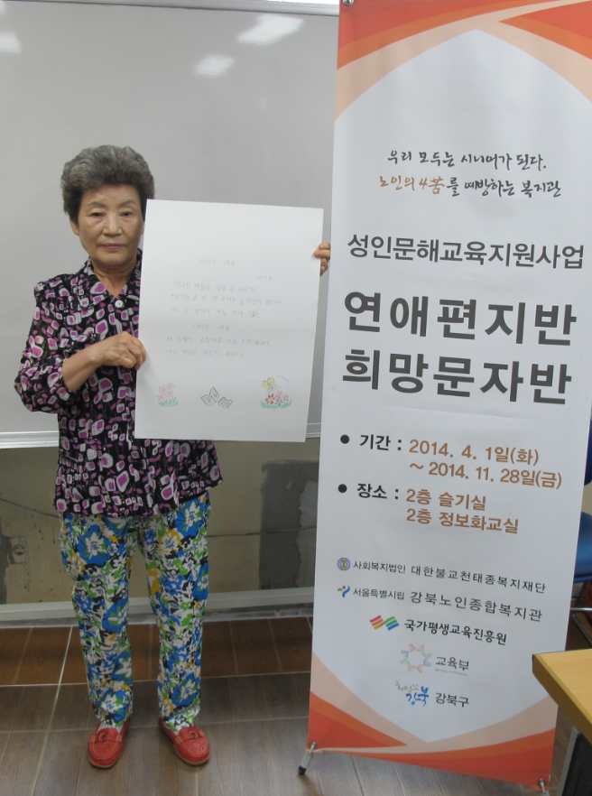 사회교육 사업에서는 성인문해교육 지원사업 수강생을 대상으로 시화전을 제작하였습니다. 희망문자반 15명, 연애편지반 15명. 총 30명이 참여하였으며, 이중 가장 뛰어난 작품 5작품을 선별하여 시화전으로 제작, 성인문해교육 거점기관인 마들여성학교에 제출하였습니다.