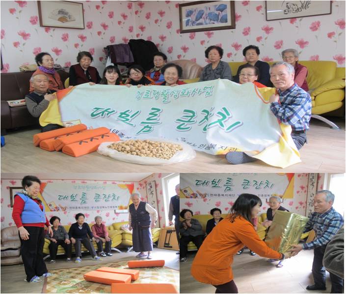 이번 정월대보름 큰잔치는 집중관리경로당 1개소에서 윷놀이, 부럼나누기, 노래자랑 등의 행사가 진행되었으며, 집중관리경로당 42개소에는 부럼을 배분하는 방식으로 진행하였습니다. 2014년 새해 경로당의 평안과 회원들의 화합을 다지는 즐거운 시간이었습니다.