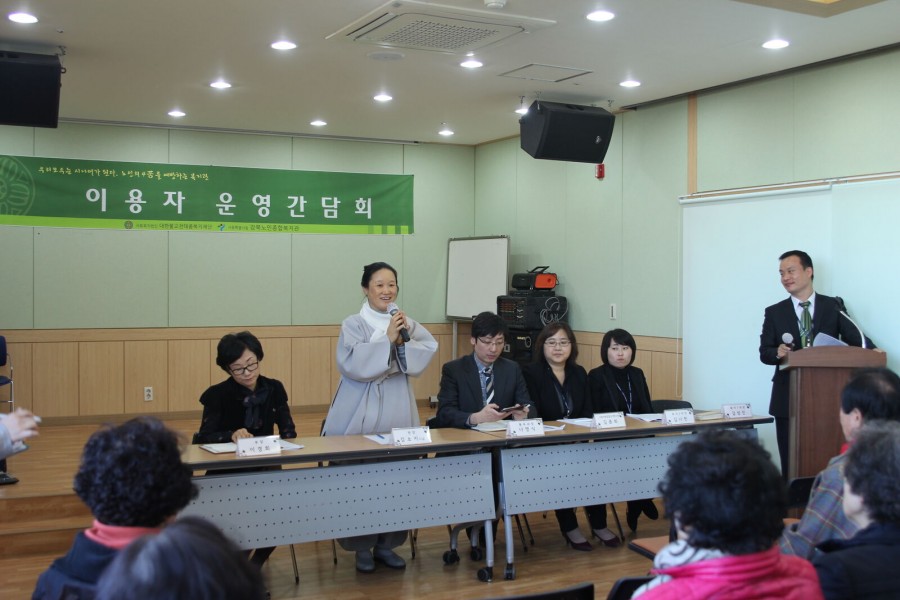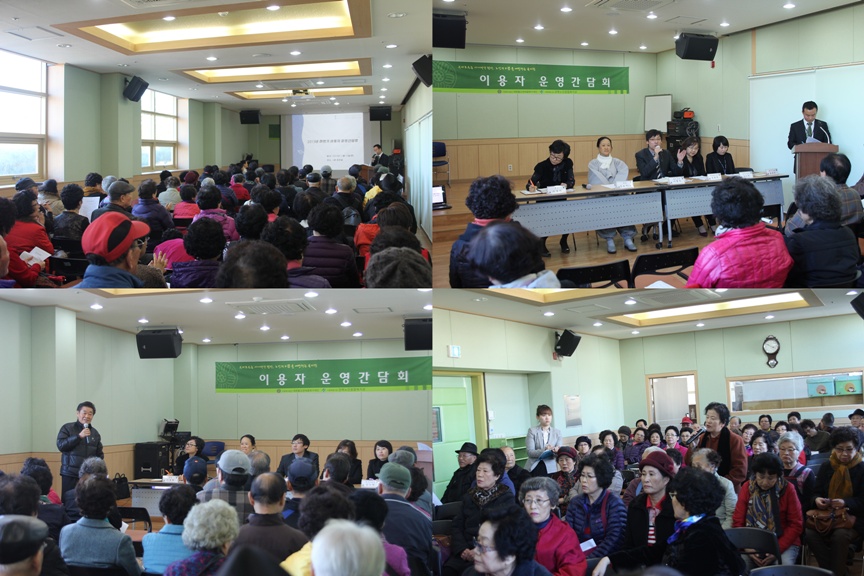 시립강북노인종합복지관 복지1과 사회교육팀에서는 복지관을 이용하시는 어르신을 대상으로 어르신들의 욕구 및 의견을 수렴하고 향후 발전방향에 대한 논의를 통해 이용자 중심의 기관을 운영하고자 「2013년 하반기 이용자 운영간담회」를 실시하였습니다.