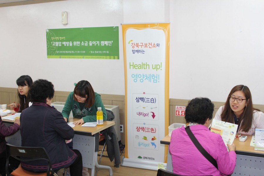 시립강북노인종합복지관에서는 어르신들의 건강한 식습관을 알리고자 강북구보건소와 연계하여 '고혈압 예방을 위한 소금줄이기 캠페인'을 경로식당 및 지하 탁구실에서 이용어르신을 대상으로 진행하였습니다.