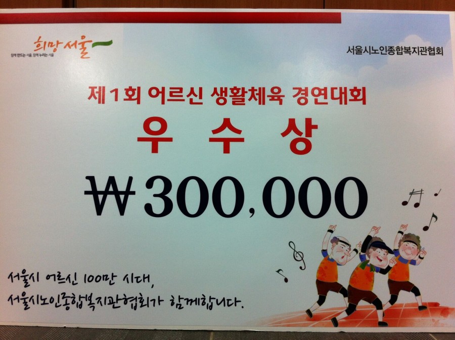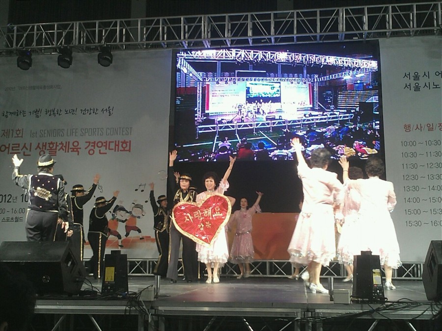 사회교육사업에서는 한국노인종합복지관협회에서 주관하는 제 1회 어르신생활체육경연대회에 참석, 총 30여개 기관 중 우수상을 수상하였습니다.공연단과 응원단 어르신들 감사드리고 축하드립니다.▣ 일시 : 2012년 10월 24일(수), 08:00~16:00 ▣ 장소 : 88체육관▣ 대상 : 천태시니어예술단 댄스스포츠 동아리
