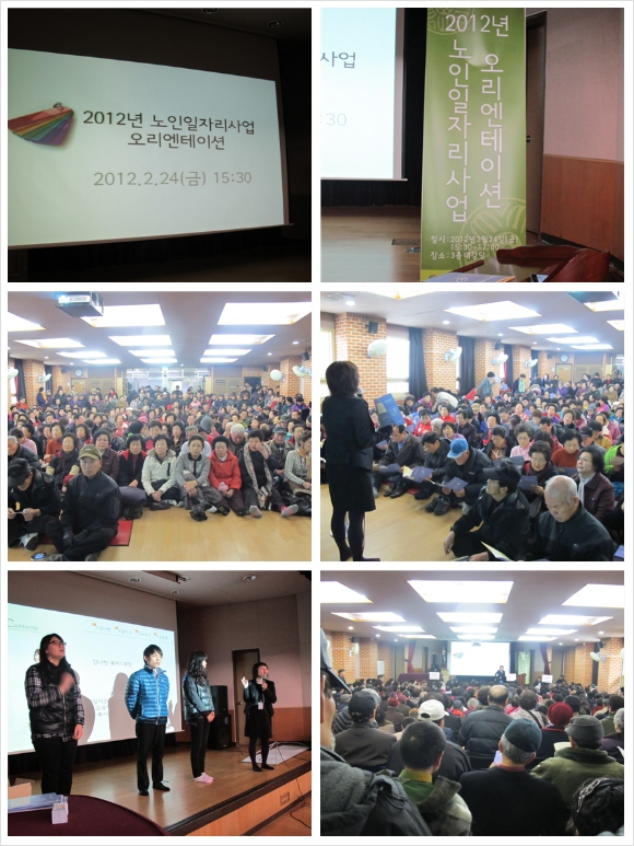 2012년 노인일자리사업 참여자를 대상으로 오리엔테이션을 실시하였습니다. 노인일자리사업 활동시 유의사항 및 활동방법에 대해 안내해드렸습니다. 우리 어르신들!! 앞으로 화이팅하시기 바랍니다. 어르신들의 적극적인 사회참여를 위해 더욱 더 노력하겠습니다.