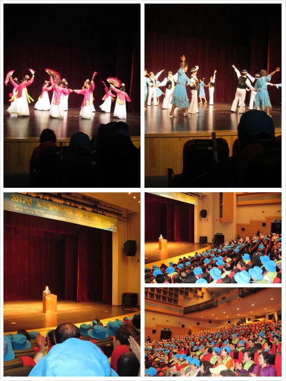 식전행사로 우리 기관 천태시니어예술단 한국무용, 스포츠댄스팀의 멋진 공연이 펼쳐졌으며, 강북구청장님의 인사말씀 및 2012년 노인일자리사업에 대한 안내가 있었습니다.
