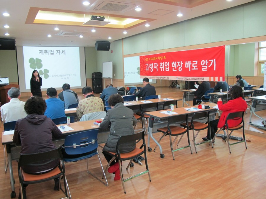 시립강북고령자 취업알선센터에서는 매월 신규가입회원에게 취업동향과 현장을 이해시키고 재취업에 대한 동기부여를 하고자 취업기초교육을 실시하였습니다. ▣일 시 : 2012년 4월 25일(수), 15:00~16:00 ▣장 소 : 3층 정진실