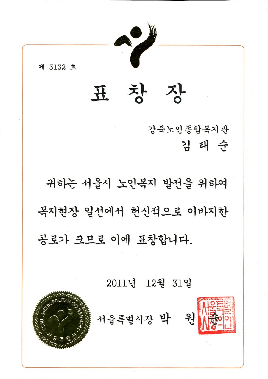 2011년 12월 31일(토) 시립강북노인종합복지관 영운관장스님께서 노인복지 발전을 위하여 복지현장 일선에서 헌신적으로 이바지한 공로가 커 서울특별시장상을 수상하였습니다.