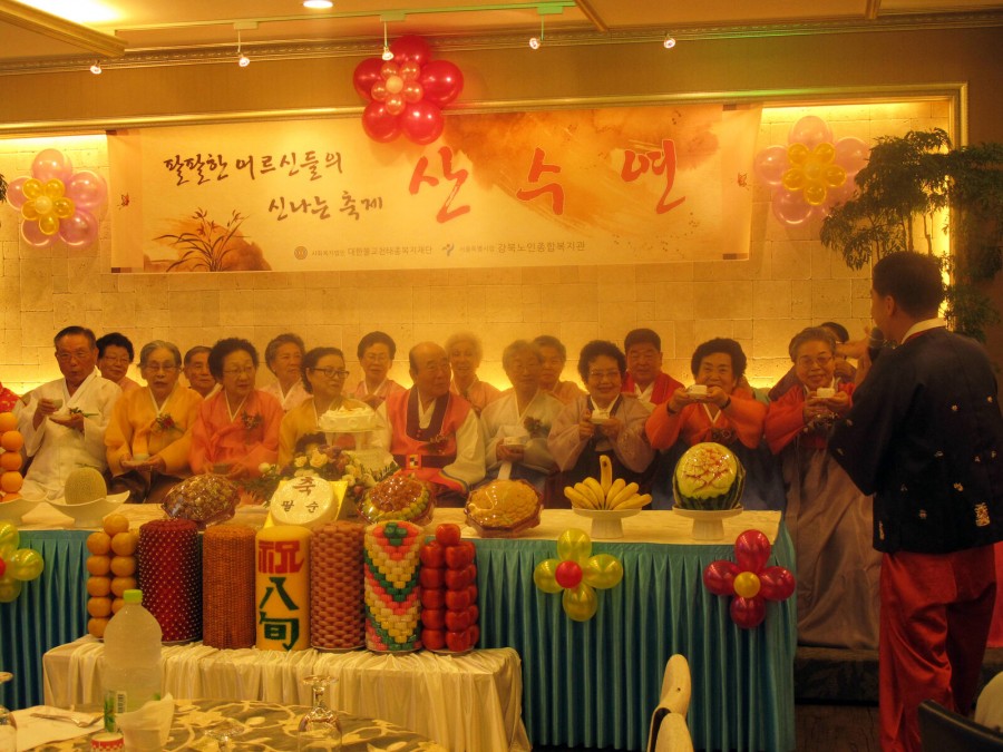 이날 행사에서는 어르신들의 팔순을 축하하기 위해 케익 커팅식과 함께 시립강북노인종합복지관 직원들과 인수동어린이집 아이들이 어버이 은혜를 합창하고, 헌주 및 큰절을 올려 산수연의 의미를 더하였습니다. 또한 남인수선생 기념 사업회의 공연으로 흥을 돋아 외롭게 노년을 맞이하는 독거 어르신들에게 행복한 추억을 만들어 드렸습니다.