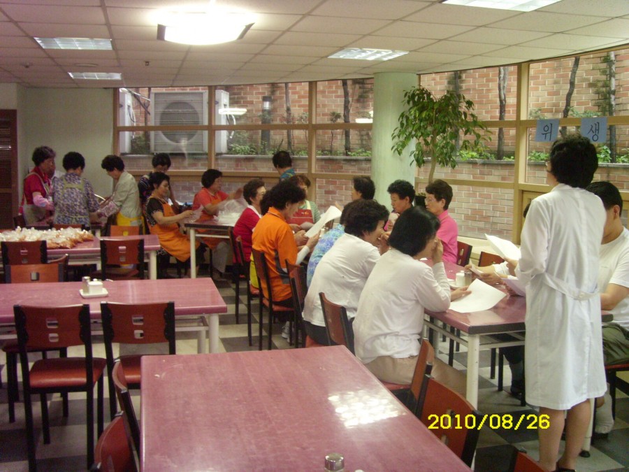 시립강북노인종합복지관은 안전하고 위생적인 급식소 운영을 통한 사고 및 질병예방을 위해 매월 영양사가 조리종사자와 자원봉사자들을 대상으로 위생교육을 실시하고 있습니다.