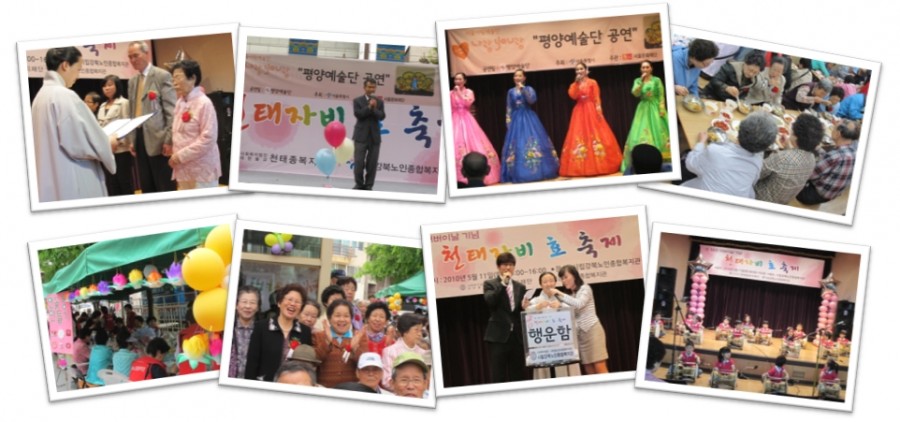 이날 행사에서는 귀여운 어린이집 손자, 손녀들이 직접 카네이션을 달아드리고, 장한어버이상 및 효행상을 시상하는 의미 있는 기념식을 진행하였으며, 궁중비빔밥과 잔치음식으로 푸짐한 무료중식을 제공해드렸습니다. 이어서 밸리댄스, 평양예술단 등 다채로운 문화공연이 펼쳐져서 효 축제의 흥겨움을 더했습니다.