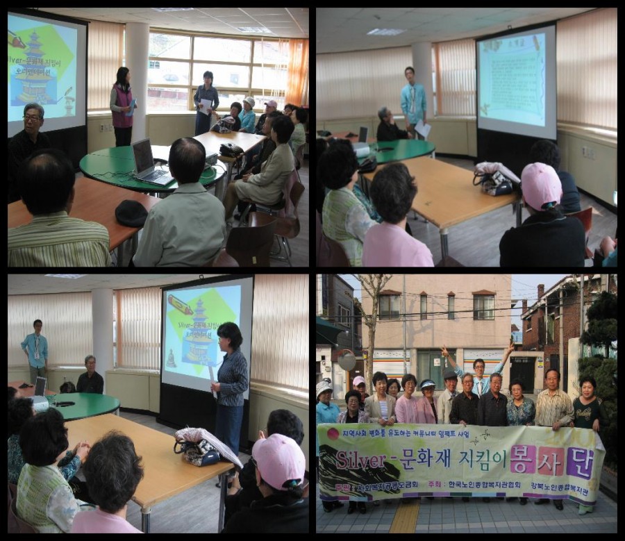 * Silver-문화재지킴이 봉사단은 오리엔테이션 및 간담회,자조모임, 평가회 등을 통하여 문화재지킴이에 대해 정기적으로 의견을 교환하고 활동이 발전되어 나갈 수 있도록 노력하였습니다.