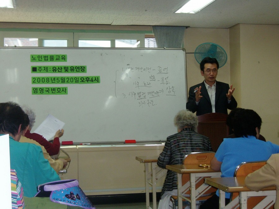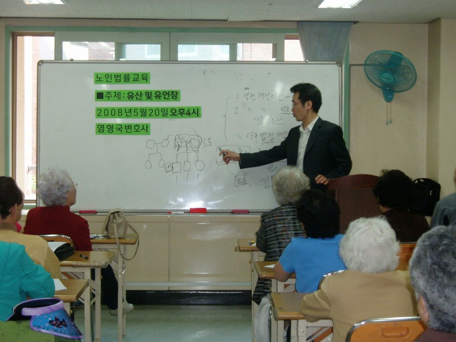 5월 20일 오후 4시 산호교실에서 노인법률교육을 실시하였습니다. 대한변호사협회 노인법률지원위원회와 한국노인종합복지관협회가 지원하는 교육으로서 '유산 및 유언장'의 주제로 염형국변호사님이 강의해 주셨습니다. 유산 증여, 상속, 유언에 관해 사례를 들어 쉽고도 재미있는 교육시간이 되었으며 뜨거운 관심 속에 질의응답으로 교육을 마치게 되었습니다. 어르신들의 법률상식이 날로 향상되는 그날까지 최선을 다하는 강북노인종합복지관이 되겠습니다.