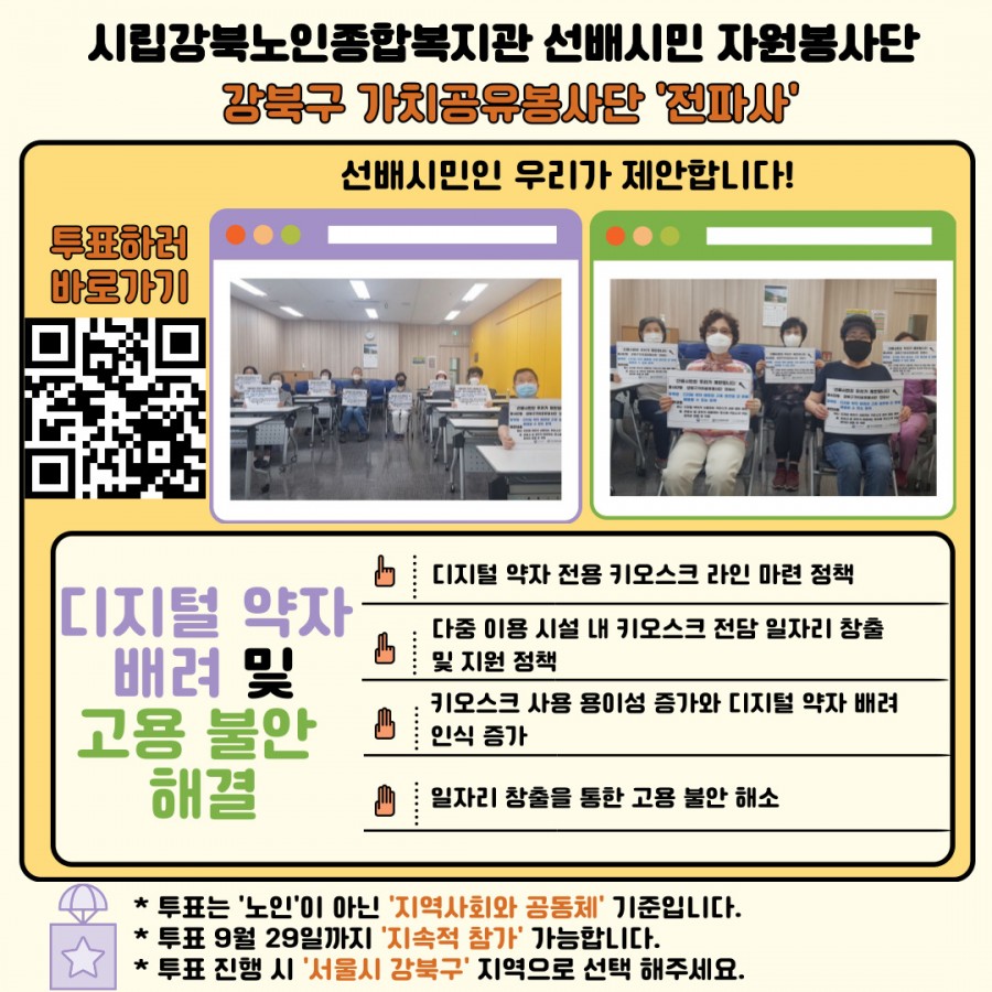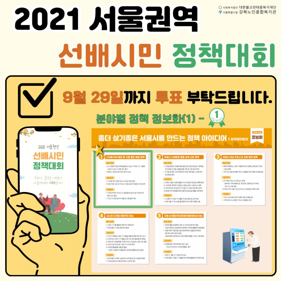 저희 시립강북노인종합복지관 선배시민은 '전국 선배시민 정책대회'에 참가하였으며 서울권역 부분에서 사전 투표를 진행하고 있습니다.
