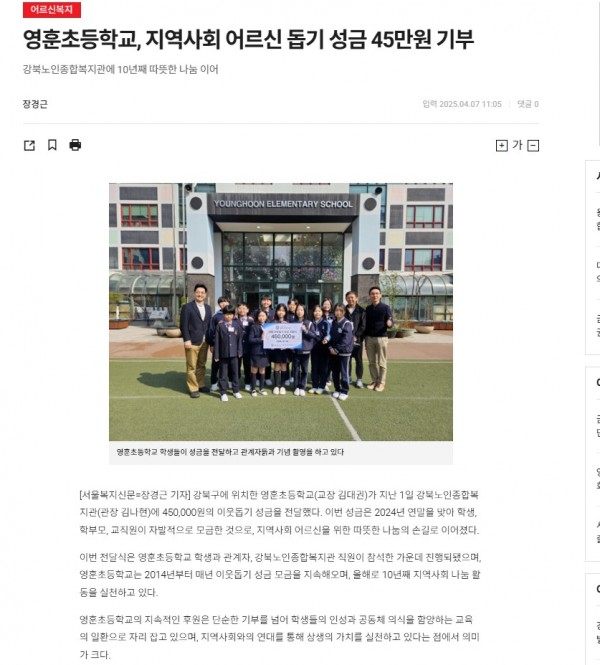 [2025.04.07] 영훈초등학교, 지역사회 어르신 돕기 성금 45만원 기부 - 서울복지신문
