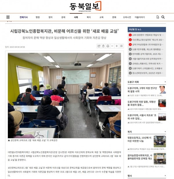 [2025.04.04] 시립강북노인종합복지관, 비문해 어르신을 위한 ‘새로 배움 교실’ - 동북일보