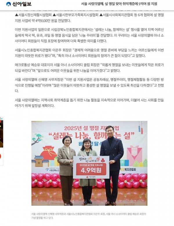 [2025.01.17] 서울 사랑의열매, 설 명절 맞아 취약계층에 5억여 원 지원 - 신아일보