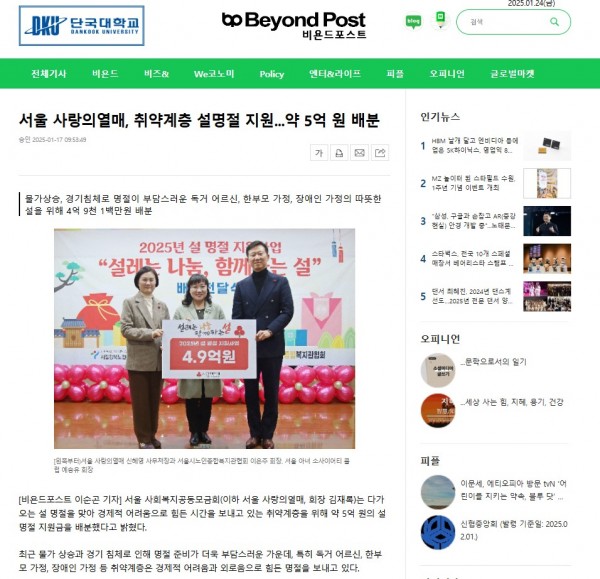 [2025.01.17] 서울 사랑의열매, 취약계층 설명절 지원...약 5억 원 배분 - 비욘드포스트