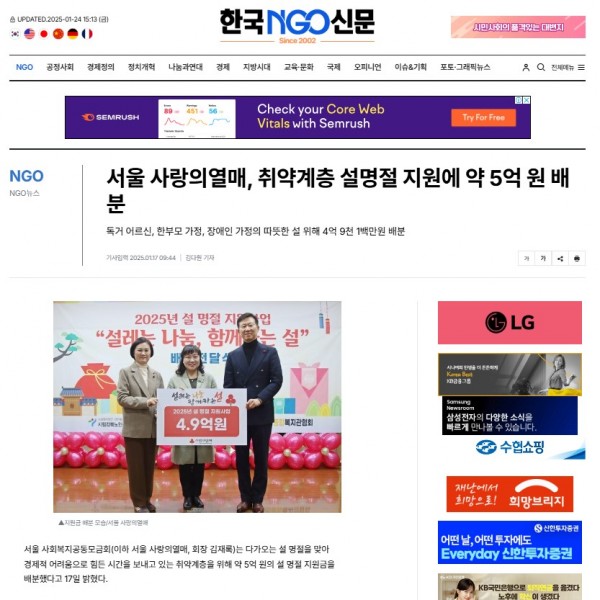 [2025.01.17] 서울 사랑의열매, 취약계층 설명절 지원에 약 5억 원 배분 - 한국NGO신문