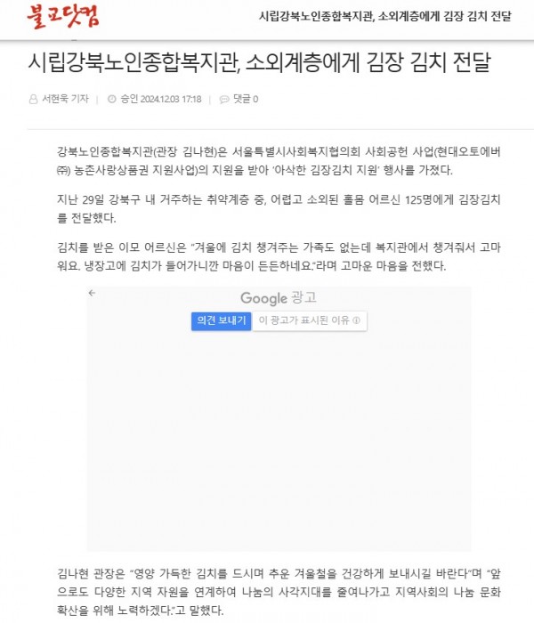 [2024.12.03] 시립강북노인종합복지관, 소외계층에게 김장 김치 전달 - 불교닷컴