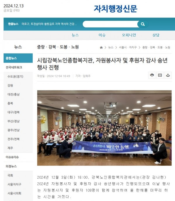 [2024.12.04] 시립강북노인종합복지관, 자원봉사자 및 후원자 감사 송년행사 진행-자치행정신문
