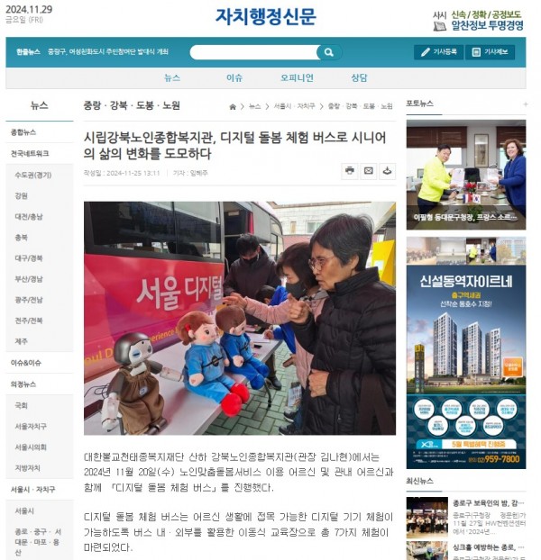 [2024.11.25] 시립강북노인종합복지관, 디지털 돌봄 체험 버스로 시니어의 삶의 변화를 도모하다-자치행정신문