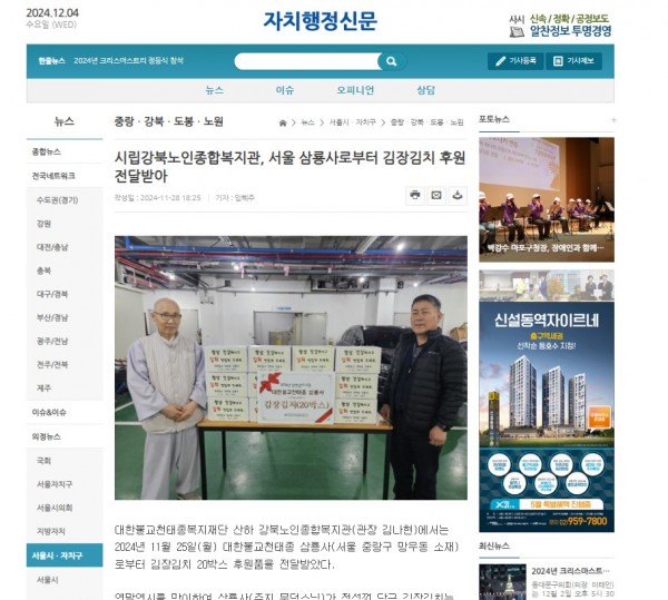 [2024.11.28] 시립강북노인종합복지관, 서울 삼룡사로부터 김장김치 후원 전달받아-자치행정신문