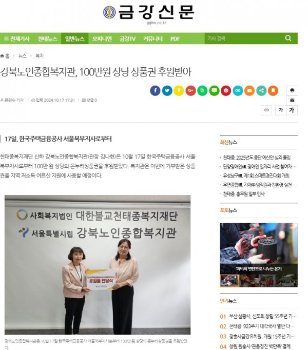 [2024.10.17] 강북노인종합복지관, 100만원 상당 상품권 후원받아 - 금강신문