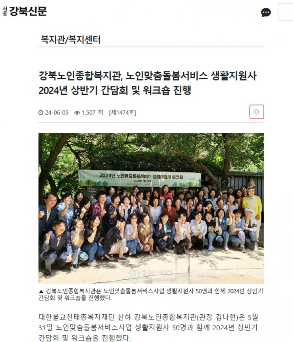 [2024.06.05]강북노인종합복지관, 노인맞춤돌봄서비스 생활지원사 2024년 상반기 간담회 및 워크숍 진행(서울강북신문)