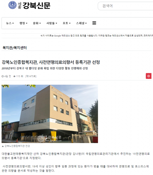 [2024.06.10]강북노인종합복지관, 사전연명의료의향서 등록기관 선정(서울강북신문)
