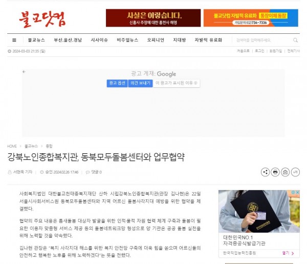 [2024.02.06] 강북노인종합복지관, 동북모두돌봄센터와 업무협약