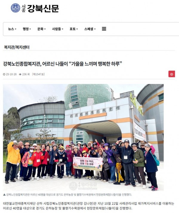 [2025.10.28] 강북노인종합복지관, 어르신 나들이 “가을을 느끼며 행복한 하루” - 서울강북신문