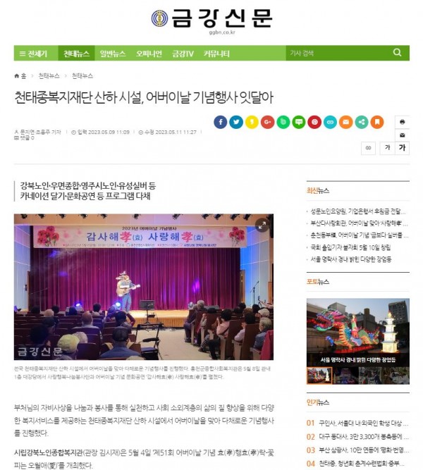 [2023.05.09]금강신문-천태종복지재단 산하 시설, 어버이날 기념행사 잇달아