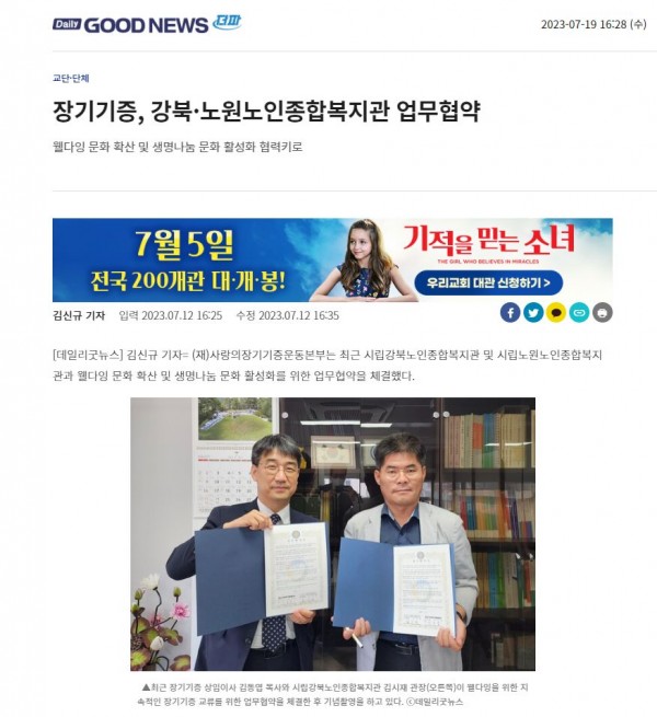 [2023.07.12]데일리굿뉴스-장기기증, 강북·노원노인종합복지관 업무협약
