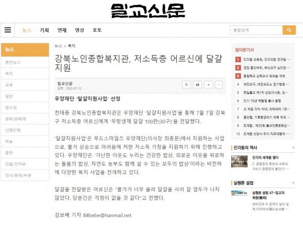 [2022.07.12] 밀교신문-강북노인종합복지관, 저소득 어르신에 달걀지원