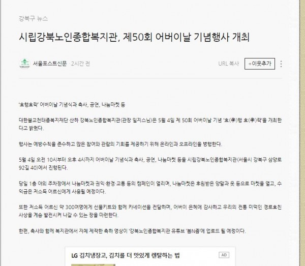 [2022.04.28] 서울포스트신문 - 시립강북노인종합복지관,제50회 어버이날 기념행사 개최