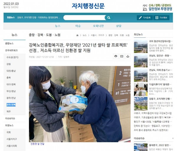 [2021.12.29] 자치행정신문-강북노인종합복지관, 우양재단 ‘2021년 쌀타 쌀 프로젝트’ 선정.. 저소득 어르신 친환경…