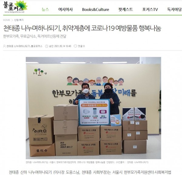 [2021.05.14] 불교포커스-천태종 나누며하나되기, 취약계층에 코로나19 예방물품 행복나눔
