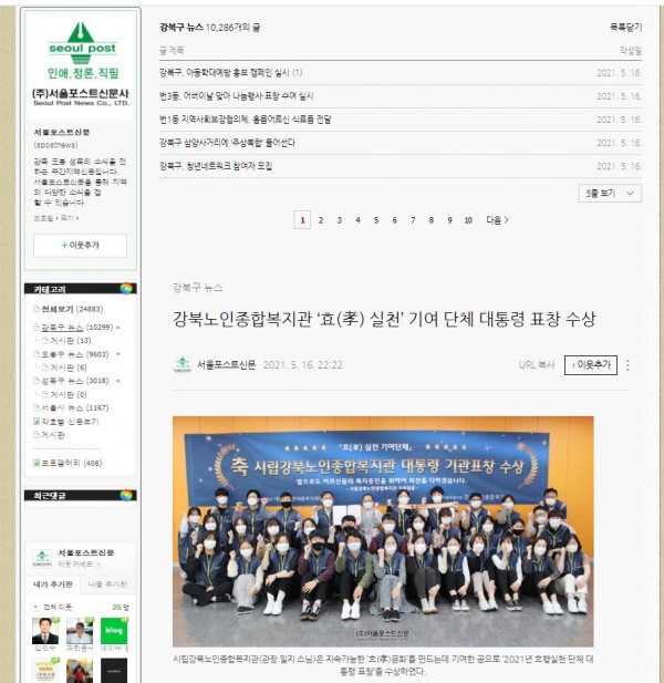 [2021.05.16] 서울포스트신문-강북노인종합복지관 '효실천'기여단체 대통령 표창 수상