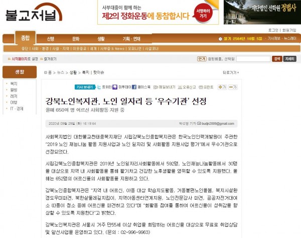 [2020.09.29] 불교저널-강북노인복지관, 노인 일자리 등 '우수기관' 선정