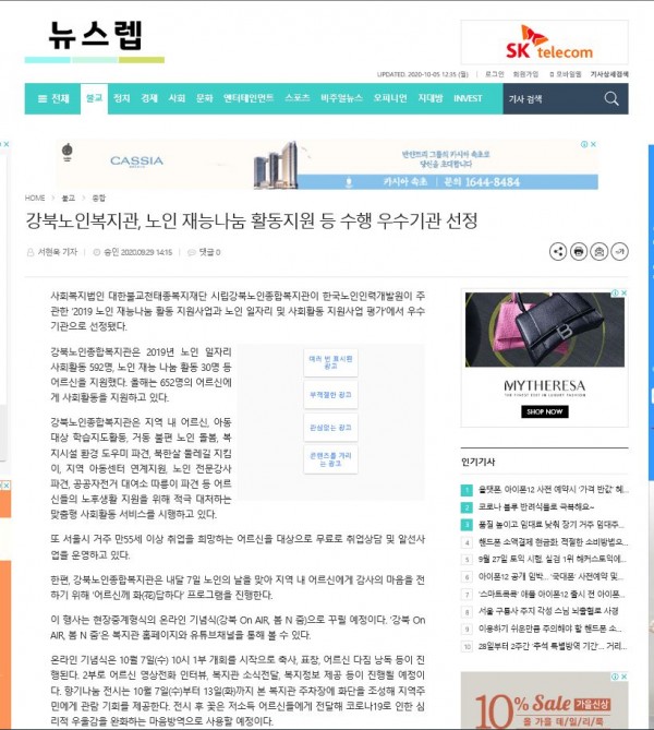 [2020.09.29]뉴스렙-강북노인복지관,노인 재능나눔 활동지원 등 수행 우수기관 선정