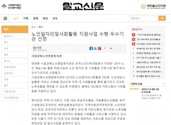 [2020.09.29]밀교신문-노인일자리및사회활동 지원사업 수행 우수기관 선정