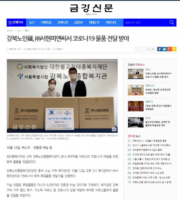[2020.10.19]금강신문-강북노인福,(주)서현피앤씨서 코로나19 물품 전달 받아