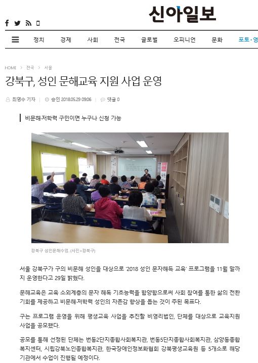 [2018.05.29] 신아일보 - 강북구, 성인문해교육 지원 사업 운영