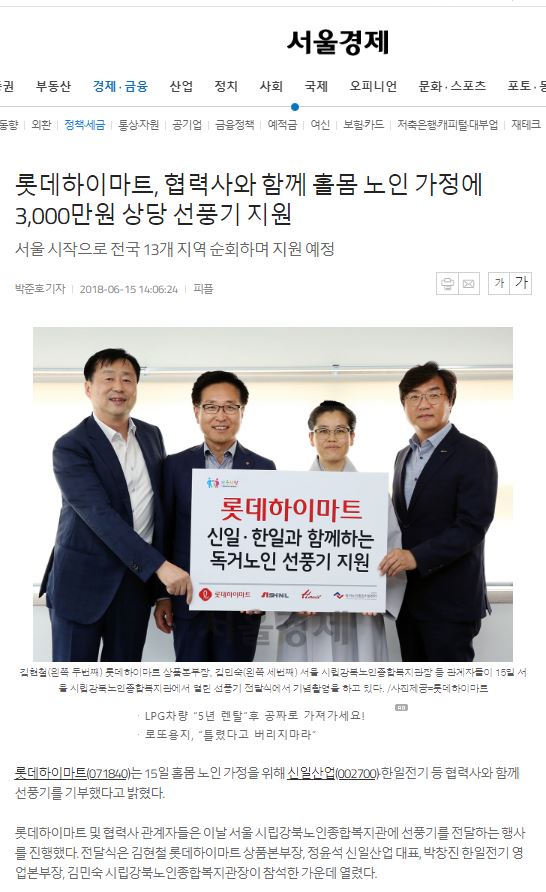 [2018.06.15] 서울경제 - 롯데하이마트, 협력사와 함께 홀몸 노인 가정에 3,000만원 상당 선풍기 지원