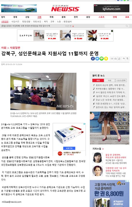 [2018.05.29] 뉴스시스 - 강북구, 성인문해교육 지원사업 11월까지 운영