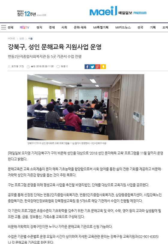 [2018.05.29] 매일일보 - 강북구, 성인 문해교육 지원사업 운영