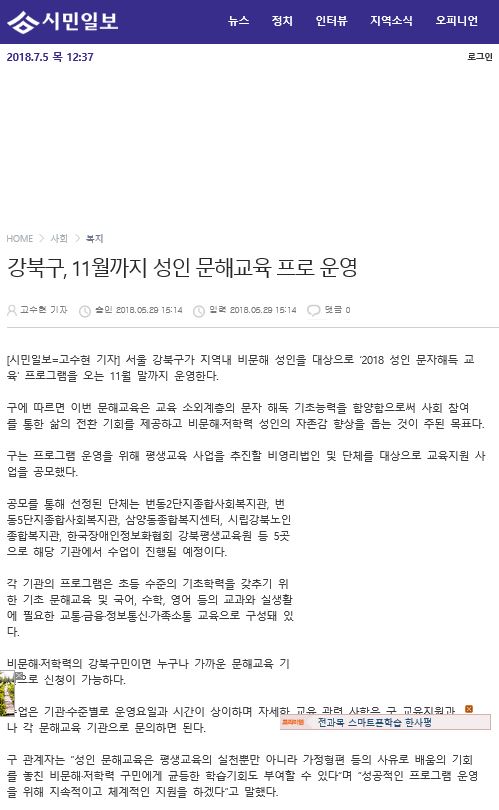 [2018.05.29] 시민일보 - 강북구, 11월까지 성인 문해교육 프로 운영