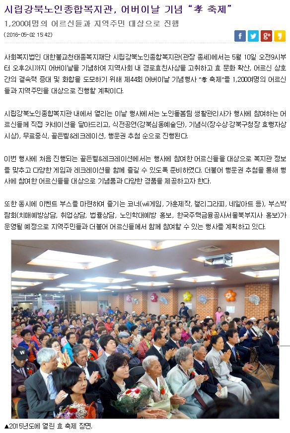 [2016.5.2] 동북일보 - 시립강북노인종합복지관, 어버이날 기념 “孝 축제”