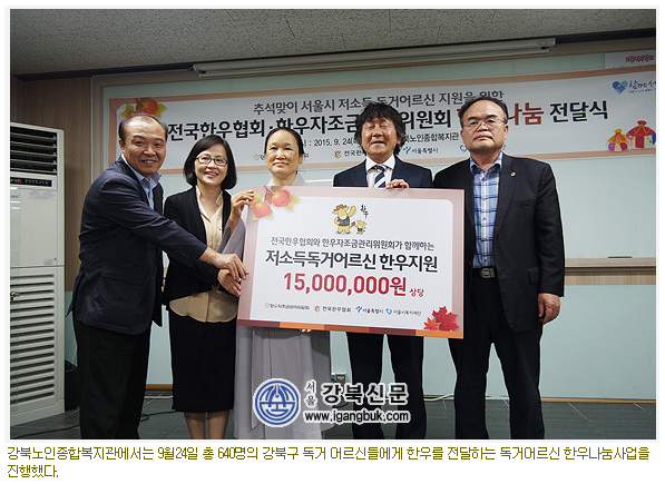 사회복지법인 대한불교천태종복지재단 시립강북노인종합복지관에서는 9월24일 추석명절을 맞이하여 더욱 소외되는 강북구 독거어르신들에게 한우 농가의 나눔문화 정서를 전달하고 복지사각지대 해소에 기여하기 위해 총 640명의 강북구 독거 어르신들에게 한우를 전달했다. 오후 1시부터 시작된 독거어르신 한우나눔사업 행사에서는 강북구 관내 독거 어르신 80명과 연계기관 내빈이 참석한 가운데 진행됐는데 내빈 인사를 시작으로 독거어르신들에게 전달할 한우선물패키지를 포장하고 정리하고 기부전달식을 진행했다. 전국한우협회는 1999년 설립하여 한우농가 사육의지를 고취하고 한우사업의 지속적인 발전을 도모하고자 하는 취지에서 설립됐으며 다양한 사회공헌활동을 통해 사랑나눔을 매년 실시하고 있다. 2014년에는 사회복지시설 저소득소외계층 한우지원사업을 실시하여 복지관, 노인요양원, 보육원 등 총 1,062개 복지시설을 대상으로 한우 22,807kg을 지원했다. 또 한우자조금관리위원회는 한우고기 소비 활성화를 통하여 한우농가의 성장과 발전을 목적으로 설립되어 다양한 사회공헌활동을 펼치고 있다. 시립강북노인종합복지관 소지관장 스님은 “이번 한우나눔사업 행사를 통해 지역사회 내 소외계층인 저소득 독거어르신들에 대한 관심을 높이고 추석을 맞이하여 따뜻함과 풍성함을 느낄 수 있도록 행사를 마련해주신 전국한우협회 및 한우자조금관리위원회 대표와 서울시복지재단 임직원 모두에게 감사드리며 앞으로 시립강북노인종합복지관은 지역사회 복지사각지대를 살피는데 최선을 다할 것을 약속 드린다”는 인사말을 전했다. | |